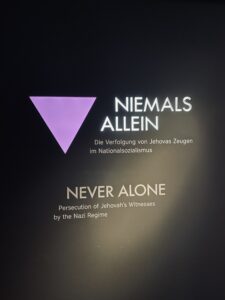 Im Anschluss fand ein Zeitzeuginnengespräch mit Ruth Schilbertz, deren Vater als „Bibelforscher“ in mehreren Konzentrationslagern. u.a. Buchenwald, inhaftiert war. 1945 kehrte er als schwer kranker Mann zu seiner Familie zurück. Frau Schilbertz sprach klar und detailliert über ihre Kindheits- und Familienerinnerungen und endete mit einem ergreifenden Statement, in dem sie sich dafür aussprach, dass wir uns alle mit Respekt behandeln, unabhängig von Religion oder Herkunftsland. „Du sollst Deinen Nächsten lieben wie Dich selbst – und wer ist denn Dein Nächster wenn nicht wir alle?“